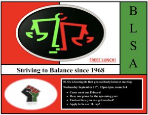 Please come out and join BLSA for our first general body/interest meeting of the year! We hope you all have enjoyed our events thus far, and we would love the opportunity to show you all what else BLSA has planned for you! We will be discussing many community service and pro-bono opportunities as well as social and professional networking opportunities. We will also be sharing information regarding our 1L rep positions! Free Lunch will be provided!