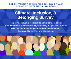How’s it going? Please let us know by taking the Memphis Law Climate & Inclusion survey. The 7-minute survey asks for information about your personal experiences at Memphis Law, your value of diversity, and optional demographical information. This year, we especially want to know about your experience in light of COVID-19.