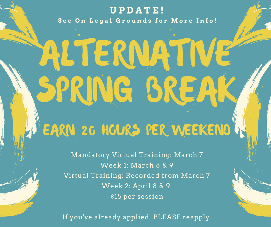 PALS is excited to announce that you now have the opportunity to earn Pro Bono hours via TWO virtual Alternative Spring Break sessions.